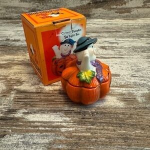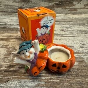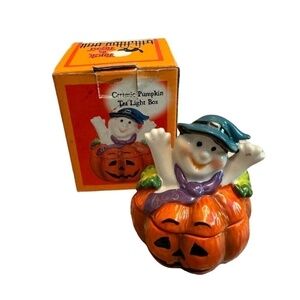 Comes with the original box, making it a great gift or collectible for Halloween enthusiasts. In excellent condition, this ceramic tea light holder is ready to light up your Halloween nights!