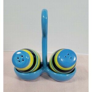 Ceramic Salt & Pepper Shakers with Holder- Blue green yellow multicolor