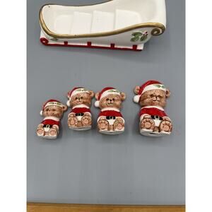 Bring a touch of holiday charm to your home with this adorable 5-piece ceramic Santa Bear Sleigh set. It includes one sleigh and four seated Santa bears, each designed to sit perfectly inside the sleigh compartments.
