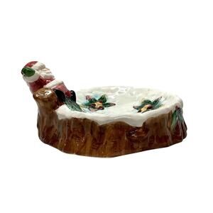Glazed ceramic holiday cookie or candy dish. Made to resemble a tree log. Features Santa waving a hand. Some very light chips on the Santa and log. Please see last couple of images.