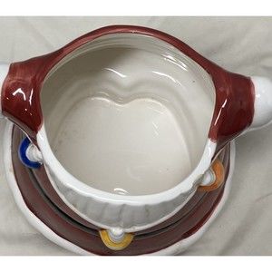 This item is approximately 12" tall, 11" long, and 8" wide and appears to be in good shape. There are two tiny chips in the cookie jar. Please check out the photos for specific details these chips and about its overall condition.