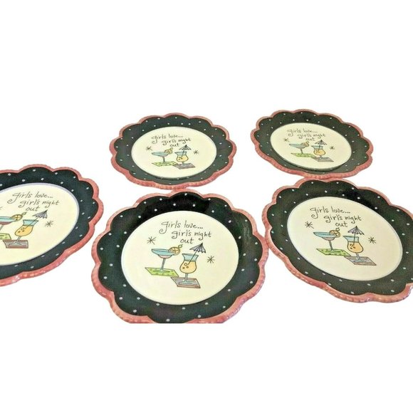 Ceramic Set of 5 Plates Girls Night Out Pink Black White Scallop