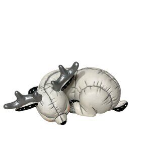 This beautifully crafted ceramic reindeer figurine features a serene sleeping posture, adorned with silver antlers and charming black polka dot accents.