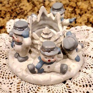 Ceramic Snowmen Pillar Candle Holder ~ 5 Cute Snowmen Circled around Center