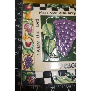 This ceramic plaque showcases vibrant fruit motifs surrounding an inspiring biblical verse. Designed by Carla Grace for Carpentree, it exudes elegance and charm.