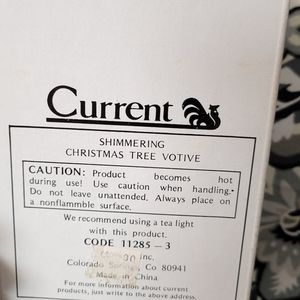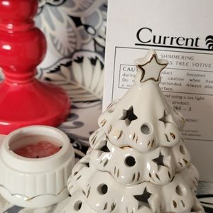 Current brand ceramic tea light tree in cream with gold accents. Measures approximately 4" w x 6" h. Small chip on bottom as shown in last picture.