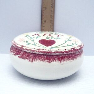 This round trinket box with lid was slip cast and hand painted painted with underglaze before the first firing. 3 coats of food safe glaze were applied to the bisque and the piece was fired again. It is 4 1/2 inches in diameter and approximately 2 1/2 inches tall. The words "Cooking is an Art of the Heart," with the word "heart" being a picture of a heart, are written on the box in an aqua color. The heart and the trim are done in raspberry. There are two yellow and pink flowers painted as a partial frame to the phrase.