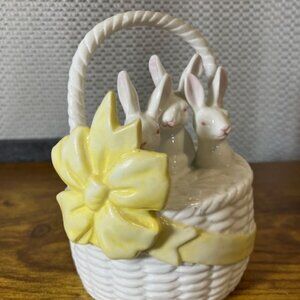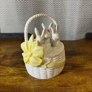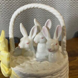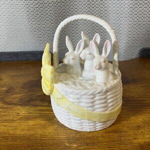 Ceramic Trio of Rabbits/Bunnies in a Basket Music Box 5"H
