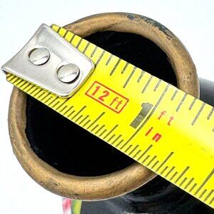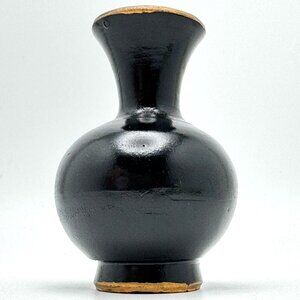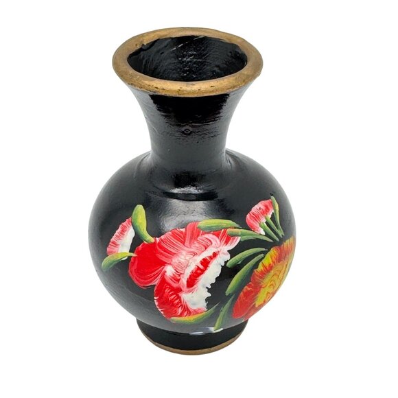 This hand-painted vintage ceramic vase features vibrant red and yellow floral motifs on a black background. Its petite size adds timeless charm to any decor.