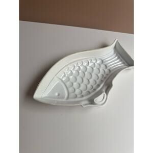White ceramic dish molded in the shape of a fish, featuring scale details and a fin handle. Measures 11 inches long.