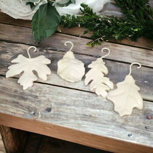 Add a touch of class to your holiday decor with these creamy white ceramic leaves. They can be hung or displayed on a flat surface such as a bookcase, entry table, or centerpiece.