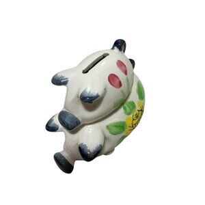 This ceramic piggy bank showcases a charming hand-painted floral design, adding a touch of whimsy to any space. Crafted with attention to detail, it offers a delightful way to save coins while serving as a decorative piece. An ideal gift or personal addition to home decor.