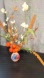 Fall ceramic vase decor. Vases are 3 inches tall. Faux fall foliage with gold leaves and pumpkins. Total height about 13 inches.