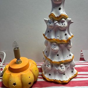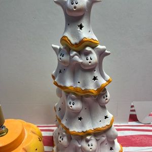 Halloween ghost stack light up. 2 piece . Done in acrylic stains. Base looks like pumpkin . Light has on and off switch.2 lites one in base and one to top