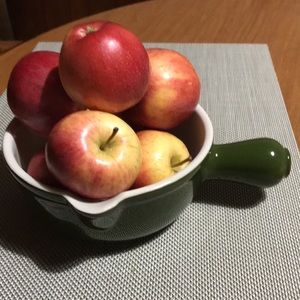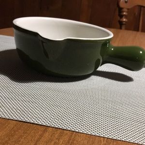 Olive green ceramic pan. Never used. I don’t know whether it’s oven or stovetop safe.