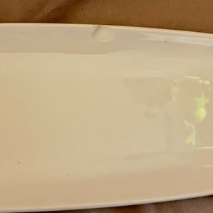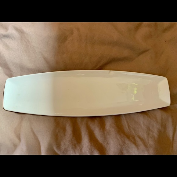 Slim white ceramic serving tray. Has a small chip at the top, still completely usable and sturdy. Perfect for small finger foods or serving napkins and utensils.