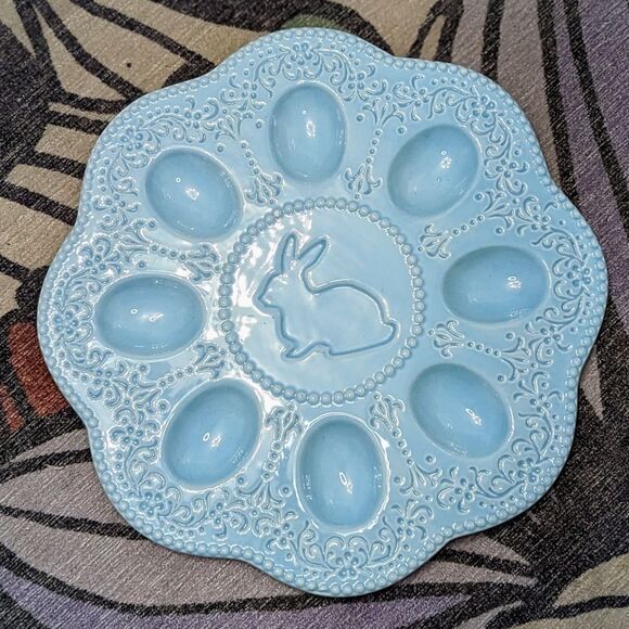 Ceramic Easter Bunny Deviled Egg Plate Blue 8 section