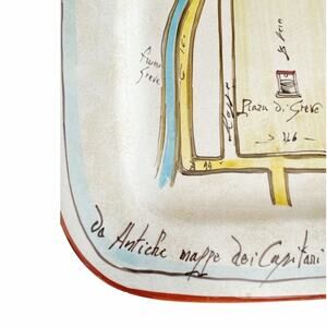 This is a beautiful serving plate that measures approximately 11 in.² and depicts an ancient map created in 1580 to 1595 of a village Square. Ceramica Geometrie create beautiful, handmade and hand painted items some of which are of historical nature. This plate depicts Tuscan style and is an antique look of beige background with a brick red rim. The actual map has dark brown, print with yellow and blue and a small red roofed church. The plate has holes on the back in which you may put wire in order to hang it, but the plate is also a beautiful serving piece. There is on the upper right quadrant of the plate a permanent minuscule piece of grit that is fired into the finish. See photos.