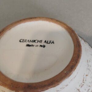 Ceramiche Alfa Italy round bowl. Bowl has an odd kitschy design with a rooster and graffiti, kind of an interesting piece. Measures 8.75" in diameter and 4.25" high. In excellent condition