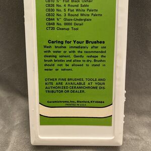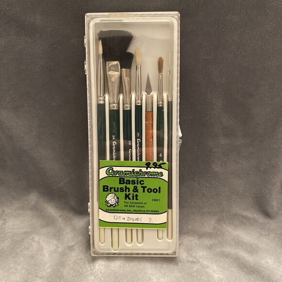 This vintage Ceramichrome Basic Brush & Tool Kit includes 6 brushes and 1 cleanup tool, perfect for ceramic painting. The kit features assorted sizes and shapes, all made with high-quality ox bristle material. Ideal for artists of all levels, this kit is a must-have for any crafting enthusiast. The brand name, Ceramichrome, adds value to this rare find. Use these brushes to create beautiful designs on your ceramic projects and make them stand out.