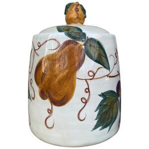 This beautiful and unique canister/cookie jar is a hand-painted ceramic piece from Tabletops Unlimited.