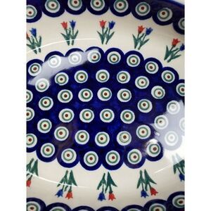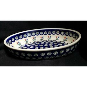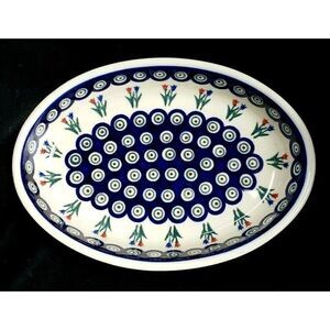 Ceramika Artystyczna 11" Ceramic Baker Vintage Boleslawiec Polish Pottery Peacock Handmade Tulips Oval Bowl Dish 11" Gift Floral Poland Ceramic Baking Serving Cooking Casserole Dish Heavy Hand Painted Housewarming New Home Sympathy Food Meal Ornate Beautiful Collectible Stamped