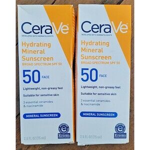 Cerave Hydrating Mineral Sunscreen SPF50 Face 2.5oz *LOT OF 2* Exp: 2/2027