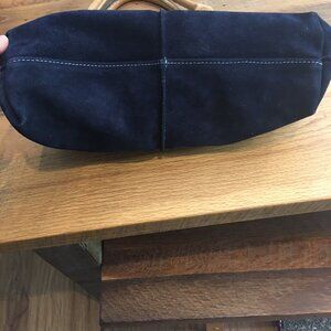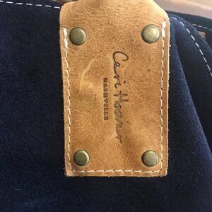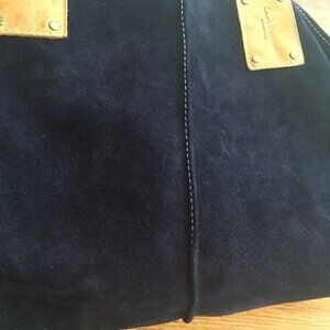 Ceri Hoover Nashville indigo blue suede with exposed white stitching leather handle tote with detachable crossbody strap. Most likely vintage but really good condition. Unlined suede bag with one open leather pocket inside. Handles show some wear but can probably be cleaned up with leather cleaner. Same with crossbody strap, with slight spot show in photos. Really, really pretty bag. This is a slouchy bag. Handles will fit over shoulder. Antique brass hardware.
