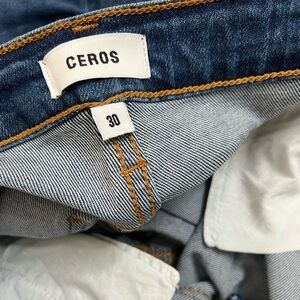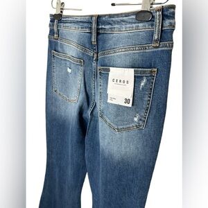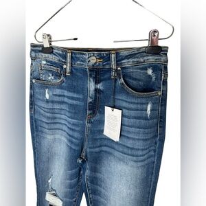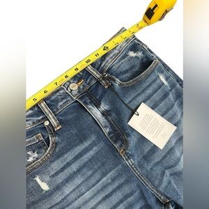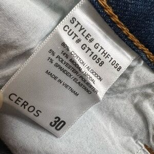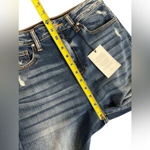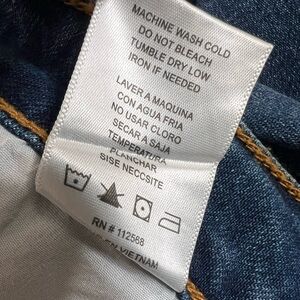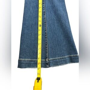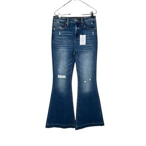 Features: High-waisted, flare leg, contrasting topstitch, distressing, whiskering and fading
