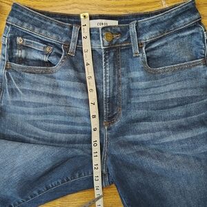 Ceros women's high rise jeans, relaxed fit, slim straight denim, size 28, stretch, 5 pockets, 28 inch inseam, 39 inch length, 91% cotton, 7% polyester, 2% spandex, button and zipper fly, looks skinny but it is not, has large thighs look closely at the measurements and stretches well, clean garment, in excellent condition.