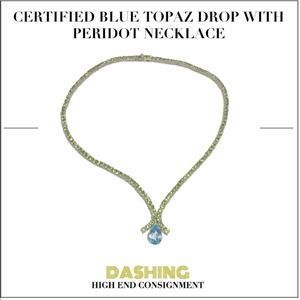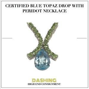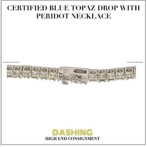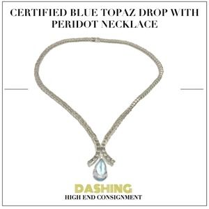 New Never Worn. Has Certified Gem-Logic Laboratory Mini Report Card: Identification #GAL20070885. Appraisal Date: 8/17/2006. Description: Blue Topaz Drop with Peridot Necklace. Rhodium Plated Sterling Silver Mounting (25.0 Grams). Necklace Contains Round Peridot Weighting 23.50 Carats Twt, Measuring 3.0 MM(Yellowish Green, LI). Shape & Cut: Pear Shape. Weight: 5.35 Cts. Measurement: 9x14mm. Color: Light Blue(Fine). Clarity: Lightly Included. Estimated Appraised Value: $1,320.00.Made in Italy.