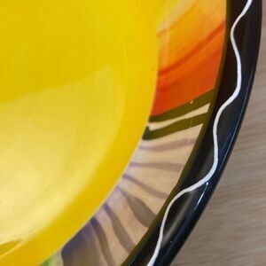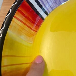 This pasta or serving bowl is bright and vibrant! There are no chips or cracks - only discolorations that look like they have always been there in the paint. These are noted in the pictures.
