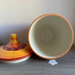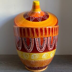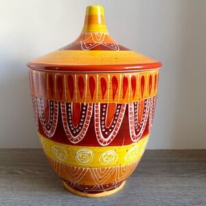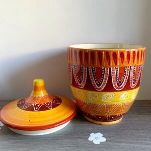 Warm up your kitchen decor with this unique Tapas biscuit jar, finished in desert-inspired brown, orange and yellow hues. Featuring a decorative lid to keep your treats fresh, this ceramic jar is accented with a rich striped circle, dot and scallop pattern.