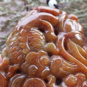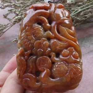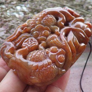 Certified Hand Carved Red Brown Natural Myanmar Burma A Jade jadeite Gold Fish Lotus Pendant Necklace 444046