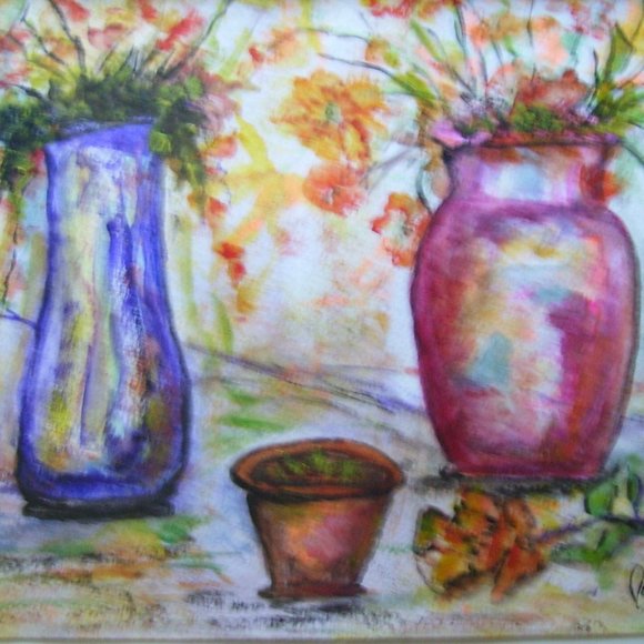 LOVELY VINTAGE 1987, JAPENESE FLORAL approximately 9X11.5 IN A WOOD FRAMED, approximately 12.5X16. PAINTING IS PAINTED WITH WATERCOLORS ON 140 WEIGHT WATERCOLOR PAPER BY TEXAS ARTIST DAVILA, SIGNED. INCLUDED CERTIFICATE OF AUTHENTICITY OF ORIGINAL BY ARTIST.