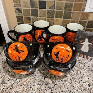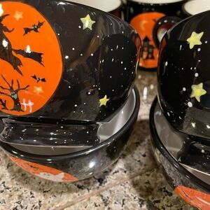 Excellent new condition! No chips or cracks! The mugs still new with tags never used! Gorgeous beautiful classic Halloween prints! Ghosts bats and pumpkins and witches! Vintage ghost napkins included. Set of 8! Very hard to find! Surrounded by yellow stars!!