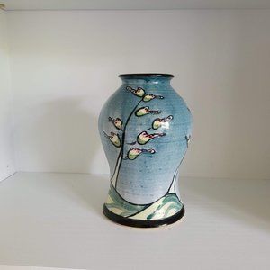Beautiful light, robin's egg blue vase with a white, red, and green abstract floral design by artist L. Berman. In excellent condition.