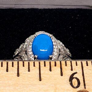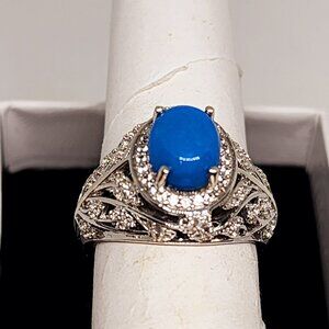 Ceruleite & Natural White Zircon halo ring in Rhodium over 925 SS 2.40ct size 6