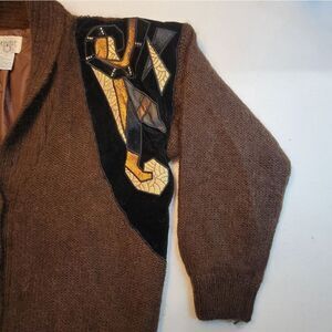 Vintage 80s Cervelle mohair knit cardigan. So gorgeous! Classic 80s design. Brown w/black & gold accents. Has patchwork design on shoulders with different materials including metallic, velvet, embroidery, & jewels / gems. Oversized