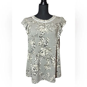 Ces Femme Gray Multi Floral Cheetah Print Top with Ruffle Detail size Large