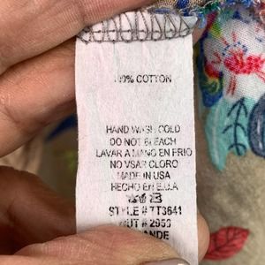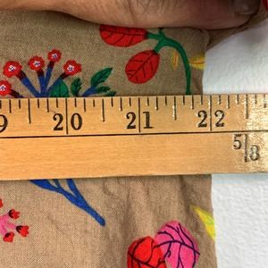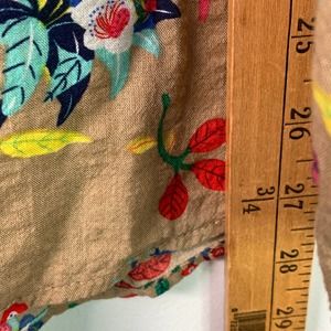Ces Femme Puffed Sleeve Tan with Orange V-Neck Taylor Top Sz L. Beautiful Blouse 100% Cotton with gorgeous Bird and Floral Designs, elastic puff sleeves for elegance and comfort.