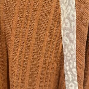 New without tags (NWOT) Ces Femme open knit v-neck sweater top. Women’s size small, fit is oversized. Dolman batwing sleeve on this top adds to the cozy and relaxed vibe. This pieces is so soft and comfy. Perfect colorway for fall this knit is a cross between burnt orange and a goldenrod. Top features animal print contrast details in cream and tan, combined with the vertical slightly open weave of the top this features are very elongating and slimming. Easily transition this piece from the office to a more casual look with leggings and a sneaker or combat boot, so many ways to style.
