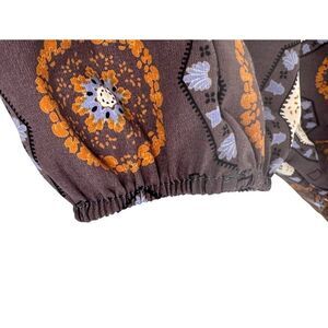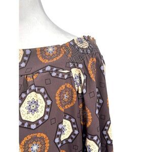 Details: Off-shoulder neckline, smocked bodice, three-quarter sleeves, elastic cuffs, geometric and floral print, 100% polyester, hand wash cold