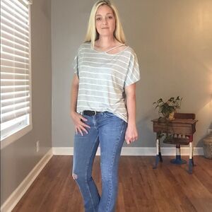 Gray Top with cream colored strips. Detailed cut out neckline .