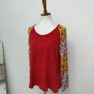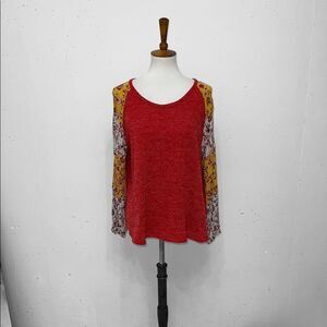 Ces Femme red orange balloon long sleeve boho mixed print floral top medium