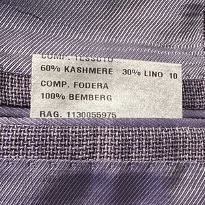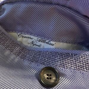 This is a fabulous jacket in a spectacular shade of lavender. I happen to know it was worn once. My husband and I won "Best Dressed Couple" at a Kentucky Derby party, and this is the jacket he wore! I recollect it was extremely hot that afternoon and he was as cool as the center seed of a cucumber! The jacket was ordered and created by Cesare Attolini of Napoli in this exact color to match my dress. It is a blend of cashmere and linen to keep an open and airy weave. The workmanship on this hand sewn garment is truly a work of art. Each and every stitch is spaced evenly and perfectly matched. The sleeves hang beautifully and the back is sleek with a nice double vent. My husband wore it with a bowtie but it would certainly look wonderful with an ascot or a purple polo. I had it martini zed after the party as you can see by the scan ticket on the inner tail.