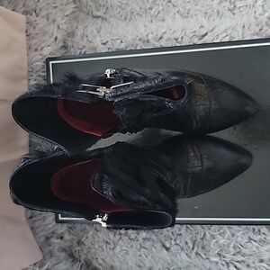 Step out in style with these elegant black boots featuring a luxurious fur trim. Perfect for adding a touch of sophistication to any outfit. Snake leather.