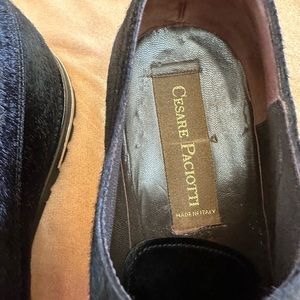 Loafers Italian Designer Shoes, Leather lined, Elastic at opening, Branded logo at front, Flat form sole, Handmade in Italy, Rubber grip sole with nice cards design. Small scratch on the silver line please see picture for details. Very nice shoes, very stylish shoes. They look very elegant.