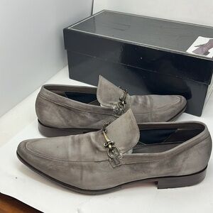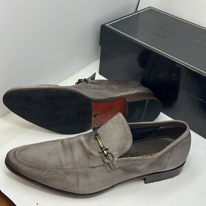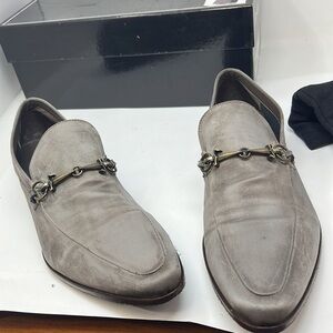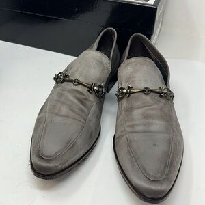 This is a beautiful pair of Cesare Paciotti Men’s Sz 7.5 Gray Silk Slip On Loafers. Worn a few tines. A new vibram sole and heels were put on and never worn since. Will come with original box and shoe bag. Minor scuffs and a small spot. Also left shoe was resealed in a small space, but hardly noticeable. No odors.