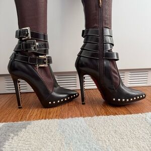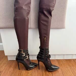 Never worn! Thigh high, stretch leather, pointed toe Cesare Paciotti boots. Chocolate brown. New in box with dust bag. 5 inch heels. Gold studs on inner heel and toes and straps on each ankle with signature Paciotti dagger. True to size, but best fit on narrow leg.